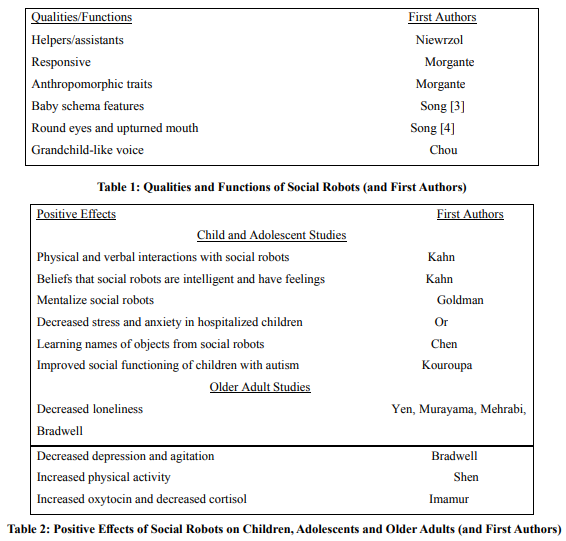 The positive effects could also be explained by higher levels of oxytocin concentrations in adults who owned social robots because high levels of oxytocin have been associated with high activity levels and low levels of depression. In a group comparison between social robot owners versus non—owners, the robot owners had higher oxytocin levels than the non-owners [15]. As few as 15- minutes of interaction with a robot led to higher oxytocin levels and lower cortisol levels in both the owners and the non-owners of social robots [15]. These data are not surprising given that oxytocin also increases following brief interactions with humans and several of the studies on social robots highlight their human qualities.