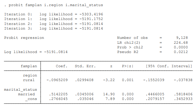 As shown in table 3; Probit model is used to model dichotomous or binary outcome variables. It models the inverse standard normal distribution as a linear combination of the predictors. The successive smaller differences in the log likelihood from 5303.4196 at iteration 0, with no explanatory variables to -5191.0814, iteration 3 with both the explanatory variables is indicative of the convergence of the probit model i.e., when its loss actually moves towards a minima with a decreasing trend. The probability of obtaining the Chi-square statistic 0.0000 is statistically significant and would result in the rejection of the null hypothesis of the independence of the two explanatory variables (region and marital status) and the dependent variable family planning services utilisation among women of childbearing age in Zambia. The two independent variables have some influence in the variations in the utilisation of family planning services among Zambian women of childbearing age. The Probit regression output shows that 2.12% of the variation in the utilisation of family planning services is coming from the two explanatory variables. Thus, the level of region and marital status as explanatory variables are only explaining 2.12% of the utilisation of family planning services, thus showing a relatively low marginal effect. The goodness of fit for the model is 2.12% implying that region and marital status of women of childbearing age in Zambia explains 2.51% of the utilisation of family planning services.