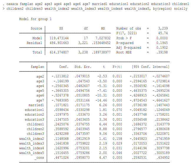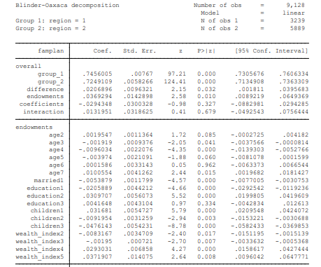 Second, we assessed the gap in family planning use between the rural and urban women of reproductive age. The Oaxaca-blinder decomposition method was employed to examine what factors accounted for this rural-urban gap. The gap was decomposed into that part that was due to group differences in the magnitudes or levels of the factors determining family planning use (determinants) and the differences in the effects or impact, as opposed to level, of these determinants. The part which looks at levels is called the endowment effect. The differences due to effects can be seen as the coefficient effect. It looks at how even if rural and urban area may have the same level of determinants, say health workers, but the effective of these determinants could be different between rural and urban areas. There is also an interaction term which measures the simultaneous effect of differences in the endowments and coefficients. Concentration curves and Oaxaca-blinder decomposition were generated using Stata version 14 (Stata, College Station, TX, USA).