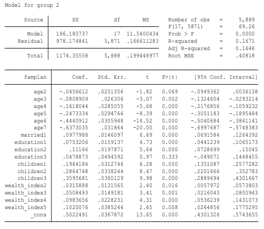 Although the model p-value is significant (0.000) as well as the p-values of the wealth indices (0.059, 0.000, 0.000 and 0.001), the extent of influence of the marginal variable is very insignificant. When compared to the poorest, the richer wealth index has the highest influence of 43.48014% of the utilisation of family planning services while the poorer index has the least of 14.83661%. The p-values for all the wealth indices are statistically significant as shown in table 2 below.