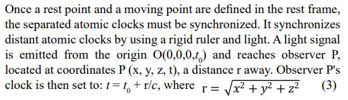 As the method of measuring the speed of light differs between rest and constant-velocity frames, the synchronization method also differs. As shown in (3), in the rest frame, atomic clocks separated in space are synchronized using rigid rulers and light. This is called synchronization of distance. However, in the constant velocity frame, rigid rulers cannot be used, so the atomic clocks in the constant velocity frame use light signals satisfying (6) to synchronize with the rest atomic clocks passing in the vicinity. This is called synchronization of vicinity.