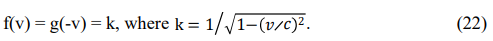 From Eqs. (16) and (17), f(v)g(-v) = c² / (c² - v²), where f(0) = g(0) = 1. In this case, if