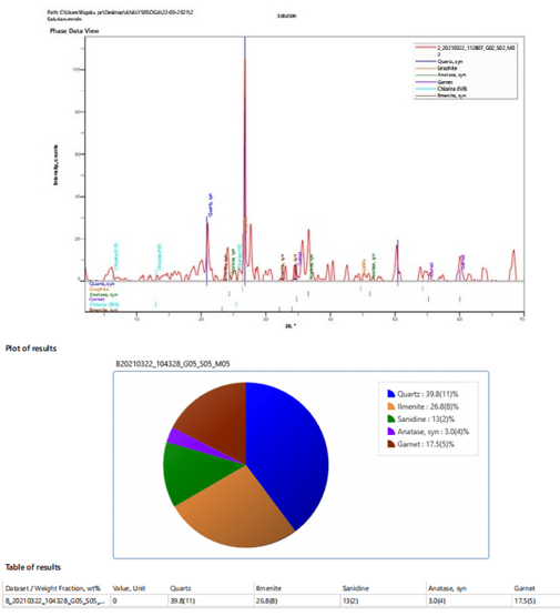 The EDXRF results are summarized in Tables 5 while table 6 served as control and a better illustration is further demonstrated inn figures 9 with the EDXRF Spectra and pre-chart for all the sediment samples as shown in Appendix 3 with the highest concentration of silica (65.768) and the lowest concentration of nickel oxide, cobalt oxide, and lanthanum III oxide (0.00). Also, deficient levels of other oxides were found in the sediment, as shown in Appendix 3 and Tables 4.82 to 4.84, with an insignificant amount of trace elements such as Fe, Cu, Zn, Ca, Ge, Lu, Ta, W, Hg, Mg, Al, Cl, K, Ti, V, Cr, Mn, and Ba. These results confirm that the sediments under this study consist mainly of quartz with little anatase and minor calcite, chlorite, garnet, and graphite. The low concentration of these oxides suggests partial purity of the sediment and shows that the EDXRF results agree with the XRD results.