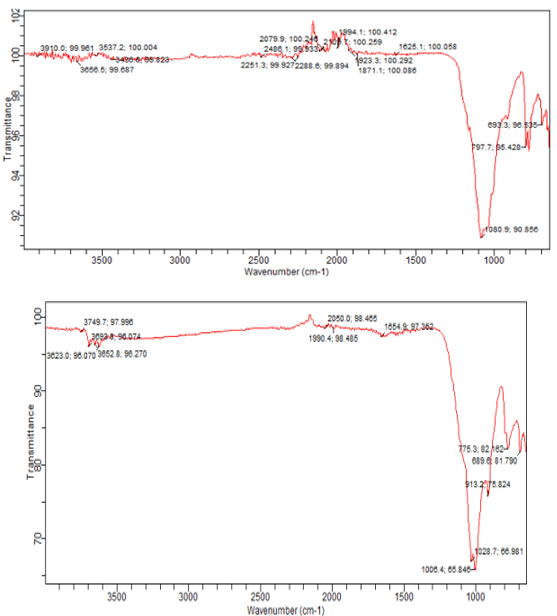 – OH (stretching) with Hydrogen Bonded, (C03) 2- Asymmetric and Symmetric Stretching, CO3) 2- Asymmetric Stretching– O– Si (asymmetrical bending), Si - O Symmetric Stretching and Si - O Si (symmetrical bending) |