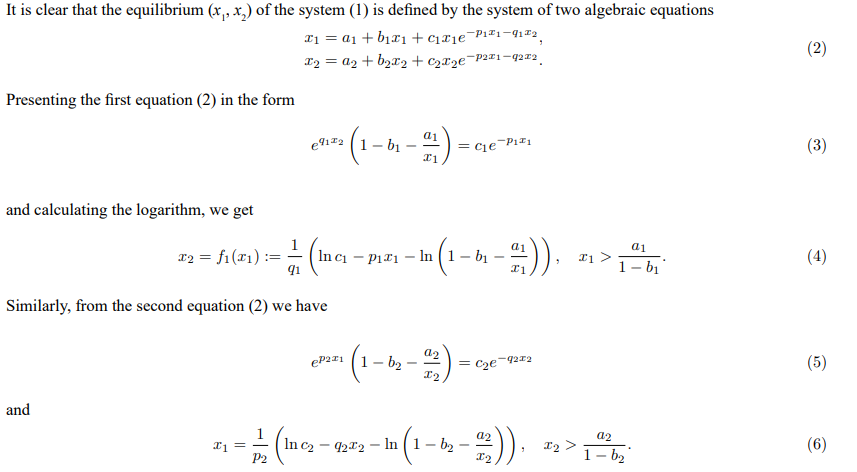 Systems of both difference and differential equations with different forms of exponential nonlinearities are very popular in research and various applications (see, for instance, [1–17] and references therein), in particular, the model from quantum physics [5], the model of Nicholson’s blowflies [2] or Mosquito population equation [12].