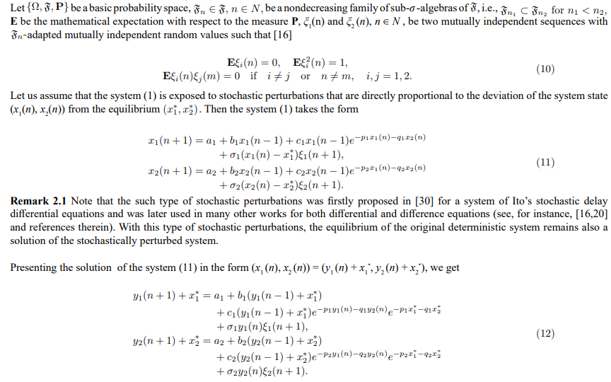 - Shaikhet, L. (2015). Stability of equilibrium states for a stochastically perturbed exponential type system of difference equations.Journal of computational and applied mathematics, 290, 92-103.