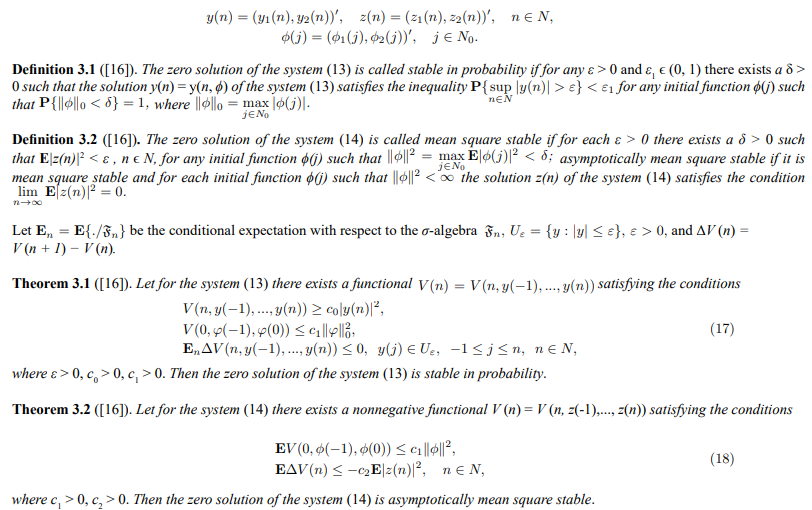 - Shaikhet, L. (2023). Stability of the Exponential Type System of Stochastic Difference Equations. Mathematics, 11(18), 3975.