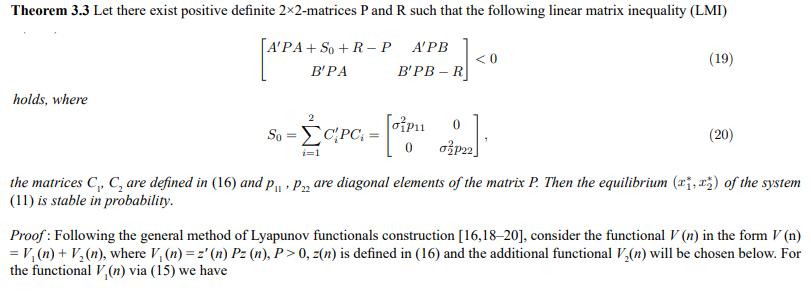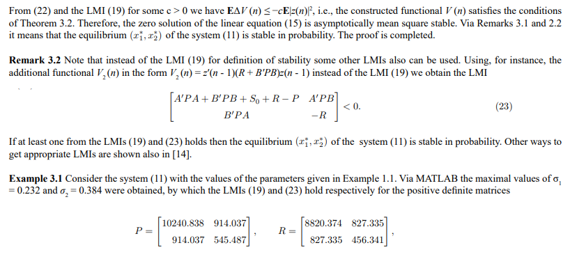 Remark 3.1 Note that the system (13) has an order of nonlinearity higher than one. It is known [16] that in this case suficient conditions for asymptotic mean square stability of the zero solution of the linear system (14) are also suficient conditions for stability in probability of the zero solution of the nonlinear system (13).
