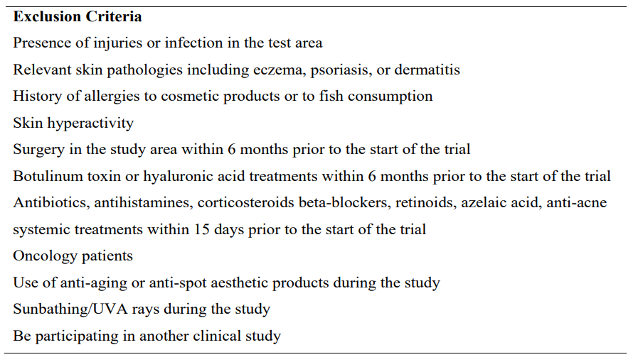 A single-center, prospective, cohort study was performed to evaluate the dermatological effects of daily oral administration of the synergistic fish collagen-based formula (INDIBA Sicily Collagen) for 56 days. Twenty-two healthy female participants, aged > 35 years with signs of skin aging, including dull and sagging skin, presence of wrinkles and fine lines, deformation of the facial contour, and nasolabial folds were included. Additional inclusion criteria were good general physical and mental health. Exclusion criteria are presented in Table 1.