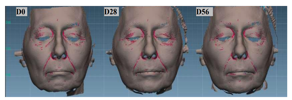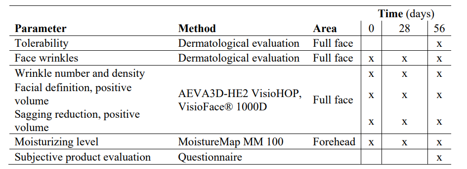 Biometric evaluation included measurements of the topography of the facial skin with AEVA3D- HE2 VisioHOP (Eotech, Marcoussis, France). Before measurement, participants were acclimatized for 10 minutes in a controlled environmental room at 20 ºC ± 2 ºC and 40%-60% relative humidity. The number of wrinkles, wrinkle density (%), and positive volume (mm3) of the face and oval (as a sagging indicator) were recorded. Moisturizing efficacy was evaluated by microtopography of the distribution of near-surface hydration in the skin (GrayIndex scale, arbitrary units, AU), based on the different capacitance in a conductive material (water-containing) and non-conductive material, with MoistureMap MM 100 (Courage & Khazaka electronic), using 3D facial photographs taken with AEVA3D- HE2 VisioHOP (EOTECH) and VisioFace®1000D (Courage + Khazaka electronic GmbH, Germany).