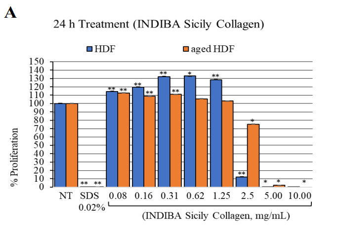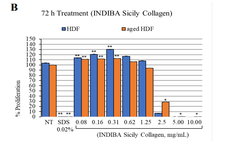 Figure 1: HDF and aged HDF proliferation at 24 h (A) and 72 h (B) after treatment with the nutraceutical (INDIBA Sicily Collagen).**, p<0.0001; *, p<0.04.