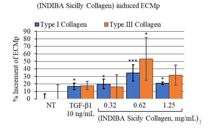 Figure 2: Nutraceutical (INDIBA Sicily Collagen) induced Extracellular Matrix proteins (ECMp) accumulation. ***, p<0.0003; *, p<0.05.