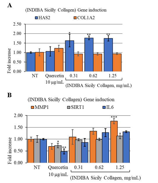 Figure 3: Nutraceutical (INDIBA Sicily Collagen) induced gene expression fold change of (A), ECMp genes HAS2 and COL1A2. **, p<0.0021; *, p<0.0035. (B), collagen remodeling gene MMP1, oxidative stress response, SIRT1 and inflammation marker IL6. ***, p=0.001.