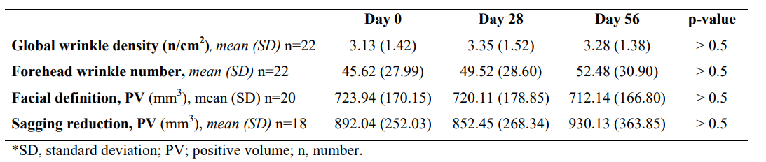 The efficacy of the synergistic formula with both structural and functional active ingredients as an anti-aging product was evaluated by assessing changes in biometric measurements throughout the study. Hydration was quantified in the forehead using microtopography (See Figure 4A showing the same participant's microtopography at D0, D28 and D56, and its GrayIndex values). Hydration levels increased from mean (SD) 81.30 AU (30.22) at D0 to 114.44 AU (41.55) at D56 (p=0.01) (Figures 4A and B). Global wrinkle density (entire face) and forehead wrinkle number did not show significant changes throughout the study (Table 3, p>0.5 and Supplementary Figure 2, Annex 1). Likewise, facial definition and sagging, both measured as positive volume, were not statistically different before and after treatment administration (Table 3, p>0.5).