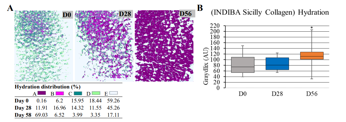 Figure 4: Hydration levels (GrayIndex). (A), representative images showing the forehead microtopography at and quantified hydration levels (GrayIndex scale) at D0, D28, and D56. (B), Box plot showing the nutraceutical formula (INDIBA Sicily Collagen) effect on the forehead hydration at D0, D28, and D56. Horizontal lines within the boxes denote median values; boxes extend from the 25th to the 75th percentile of each group's distribution of values; whiskers denote adjacent values (i.e., the most extreme values within 1.5 interquartile range of the 25th and 75th percentile of each group); *, p=0.01.