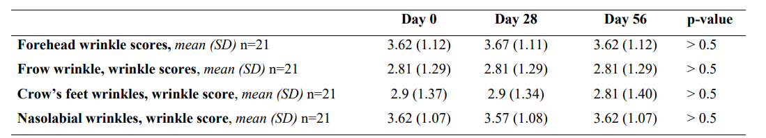 The external dermatologist classified wrinkles in the forehead, frown, crow’s feet, and the area around the nasolabial fold as shallow to moderately deep wrinkles, with mean (SD) scores ranging from 2.81 points (1.29) to 3.67 (1.11). No significant changes were observed during the study period (p>0.5) (Table 4).