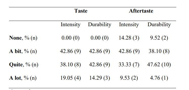 The questionnaire's average scores for organoleptic characteristics of the formula are presented in Table 5. Less than half of the participants found a bit of taste durability and intensity (42.86% and 42.86%, respectively). Aftertaste intensity was defined as “a bit” by 42.86% of patients and durability as “quite” by 47.62%.