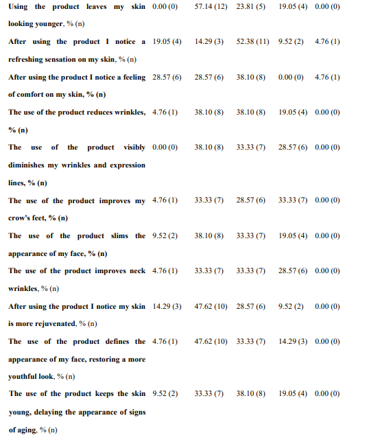 Regarding global organoleptic characteristics, after 56 days of continuous use of the nutraceutical, 80.95% (n=17) of the participants liked the product a lot and moderately (Table 6). Aroma and color were liked a lot and moderately by 69.91% (n=13) and 47.62% (n=10) of participants, respectively. Texture and flavor were found satisfactory by 42.86% (n=9) and 71.43% (n=15). Regarding perception of efficacy, after using the product, 76.19% of participants found the area more nourished (See Supplementary Table 3, Annex I, totally agree and agree, n=16), the skin soft (76.19%, n=16), more moisturized (80.95%, n=17) and less tight (71.43%, n=15). The nutraceutical improved the self-perceived appearance of the skin in 71.43% of participants (n=15), skin texture in 76.19% (n=16), and firmness and elasticity in 61.91% (n=13) and 57.15% (n=12), respectively. Packing subjective evaluation is presented in Supplementary Table 4 (Annex 1).
