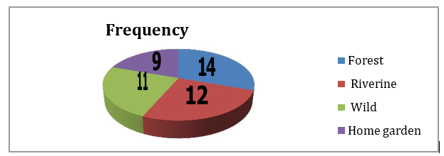 The people in Metekel Zone collect wild edible plants from vari-ous habitats, such as forest, riverine, wild and home garden. The largest number 30.4% species) was collected from forest habitats only, and followed by riverine banks (26.08%). The third and fourth largest natural habitats were wild and home garden habitat that each comprised 23.9% and 19.56% respectively (Fig 2). This finding is in line with studies performed in Ethiopia [11, 30-32].