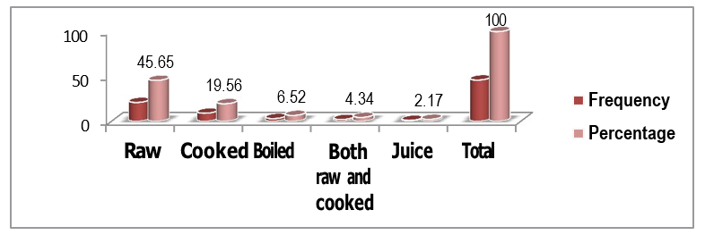 In study area about WEPs as regards the mode of consumption, 21 (45.65%) are consumed raw, 9(19.56%) cooked, (6.52%) both cooked and raw and (4.34%) in juice form, (Figure 4). The highest percentage distribution on mode of consumption of wild edible plants is shown below (figure :4). This result is similar with the study conducted by[23,24,33-35].The high consumption of wild edible plants in the form of fruit and vegetable might be explained by their nutritional value and their desirable taste [ 22,36,37,]. The high percentage of raw edibles may be due to the nature of the fruits that are not needed further processing and it might be good to consume in raw forms and the other reason might be raw fruits are good source of nutrients that does not loss its nutrients but if it is boiled or cooked some essential nutrients might be lost. This is consistent with other findings including these of [31].