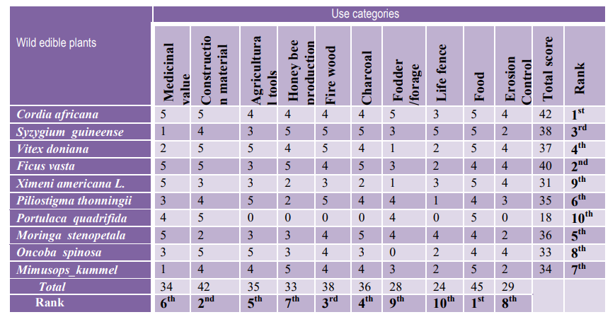 In Metekel zone, ten commonly reported multipurpose species and ten use-categories were used for in direct matrix ranking exercise. In addition to food values, the local people used the plants for oth¬er different purposes such as fuel wood, life fence, construction materials, medicine, agricultural tools and charcoal. The result of direct matrix ranking revealed that Cordia africana, Ficus vasta, Syzygium guineense, Vitex doniana and Moringa stenopetala were ranked first to fifth, respectively. Similarly, the ten use-values cat¬egories reported on ten selected plant species were summed up and ranked and, the result showed that food value, construction materials, fuel wood collection, agricultural tools , medicine value, honey been hugging, erosion controlling ,life fence were ranked first, second, third, fourth, fifth, sixth and seventh, respectively. Cordia africana were also reported to be the most commonly used parts for baking bread and in rope preparation respectively.