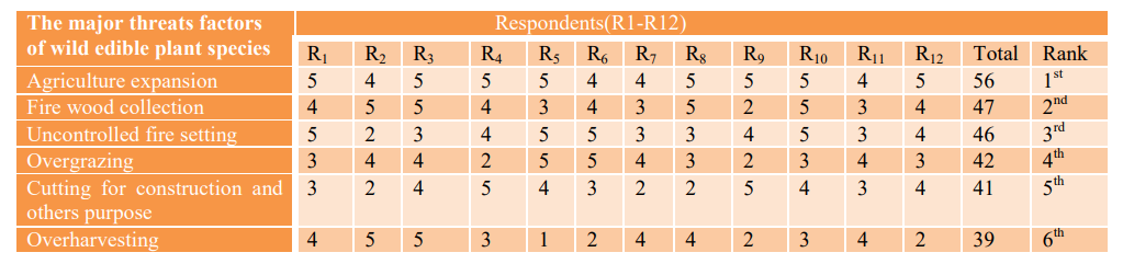 Informants ranked study area comparison of six threatening fac-tors of wild edible plants was conducted using 12 key informants. The results (Table 5) indicated that expansion of agricultural land, fuel wood collection, timber production, cutting for construction, un-controlled fire setting and overgrazing management problems of plant resources respectively. Similarly, these threats to WEP resources have been reported in ethnobotanical studies conduct- ed in Ethiopia by [20,21, 26,29-31]. This is because rapid human population and high demand for forest and forest products uses in the study area from time to time. Due to these reasons, plant species such as Phoenix reclinata, Mimusops, kummel, Syzygium guineense, Carissa spinarum and Pappea capensis, Cordia africana and Diospyros mespiliformis are among the wild edible plants un¬der series threatened and near threatened species respectively in the study area.