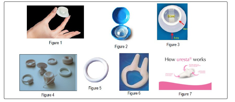Stress urinary incontinence (SUI) is prevalent among women of all ages, particularly menopausal women. SUI is under-reported by women as well as under-diagnosed and treated by doctors. A woman using the FemCap for contraception reported that she had suffered from stress urinary incontinence, but her SUI subsided when using the FemCap (Figure 1,2,3) [1-8]. Thankfully, she shared her experience, which led me to investigate a new usage for the FemCap as an SUI pessary called FemContinence. The first line of therapy of SUI is pelvic floor muscle Kegel exercises and vaginal pessaries. (Figure 4). The most popular is the ring pessary (Figure 5); however, a variety of shapes and sizes (Figure 6, 7) are becoming available to achieve better results [9,10].