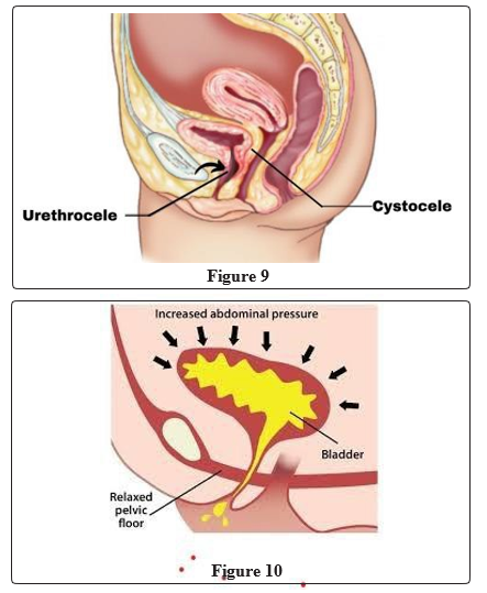 The leading causes of SUI include pregnancy, vaginal delivery, and pelvic floor muscles weaken, causing pelvic organs to prolapse. When the bladder prolapses (cystocele), it stretches, widen, and kinks the urethra, which leads to distortion of the urethral sphincters that become incompetent (Figure 9).