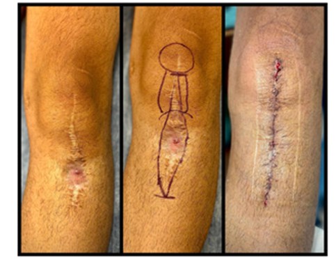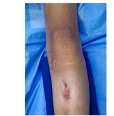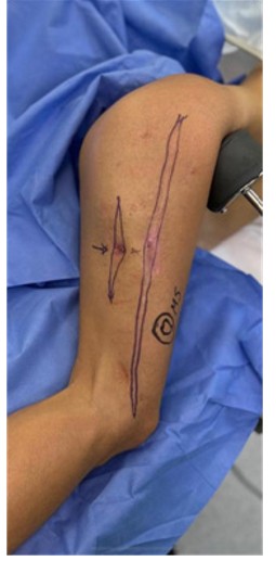 Legend: Clinical image of the lower limb demonstrating the fistula site and preoperative markings for the incision.