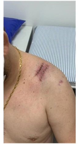 Figure 5: Postoperative image showing a narrow skin bridge following wound closure in the shoulder region.
