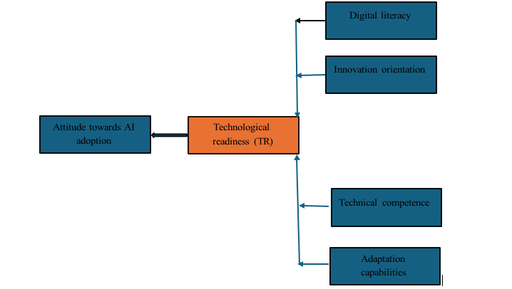 The study is grounded in the Technology Acceptance Model (TAM), with technological readiness as the independent variable (analysed through digital literacy, innovation orientation, technical competence, and adaptation capabilities) and attitude towards AI adoption as the dependent variable.