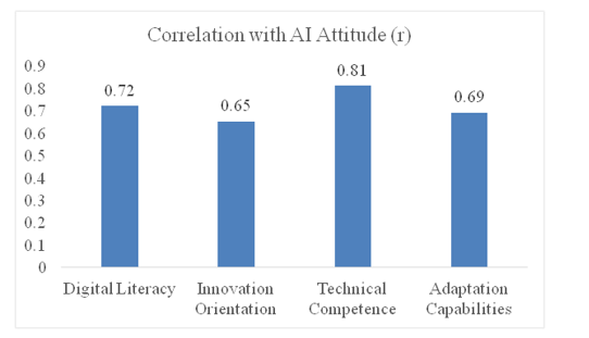All TR components show strong positive correlations with AI adoption attitudes. Technical competence (r = 0.81) is the strongest predictor, aligning with Han et al. (2024), who found technical mastery critical for AI integration in auditing.