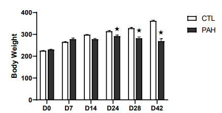Figure 1: Body weights of control (CTL) and pulmonary arterial hypertension (PAH) animals at days 0, 7, 14, 24, and 28. Values are means ± SEM; «significantly different from CTL animals.