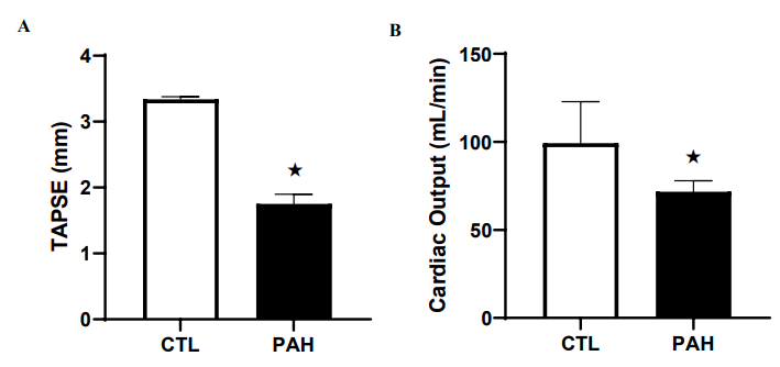 Figure 2A: Values of TAPSE in normal controls (CTL) compared to that in pulmonary arterial hypertension (PAH) rats complicated by right heart failure (RHF).