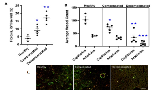 Vessel counts: To assess vascularity in CTL, adapted and mal- adapted RV free wall from PAH animals, 10µm tissue sections were stained with anti-rat smooth muscle actin primary antibody (1:100, Sigma) and FITC-conjugated goat anti-rat secondary antibody (1:400, Abcam), and TRITC conjugated isolectin IB4 (Thermo). The stained tissue sections were imaged by confocal microscopy (Leica) and analyzed using ImageJ (Fiji). 10 cryo- sections were analyzed per animal.