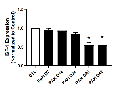 IGF-1 is a potent regulator of inflammation and angiogenesis, and reduced IGF-1 has been described as part of the RV muscle failure molecular signature complicating PAH [30,31]. IGF-1 protein expression in the RV muscle of PAH rats were similar to that in CTL animals between days 7and 24 (Figure 4). At day 28 a significant 45% reduction (P < 0.001) in IGF-1 expression in the RV of PAH rats was noted compared to CTL (Figure 4). Right hearts undergoing maladaptive hypertrophy, at day 42, also showed a 45% decrease in IGF1.
