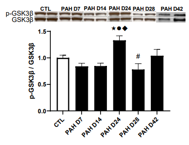 GSK-3β is known to play an important role in regulating gly- cogen metabolism in cardiac muscle and in the integration of hypertrophic signaling in the heart has been increasingly empha- sized [17]. Phosphorylation of GSK-3B (Ser9) inhibits its protein kinase activities, which diminishes GSK-3’s inhibitory effects on eIF2 to promote protein translation and hypertrophy. Phos- pho-GSK-3β, values at days 7 and 14 were similar between CTL and PAH rats (Figure 6). However, P-GSK-3β was significantly increased by 1.3-fold in PAH rats at day 24 respectively (P < 0.001 and P < 0.001). At day 28, P-GSK-3β was significantly re- duced (P < 0.05; Figure 6). Interestingly, there was no significant difference in phosphorylation of GSK-3β between maladapted/ failed RV of PAH and CTL hearts.