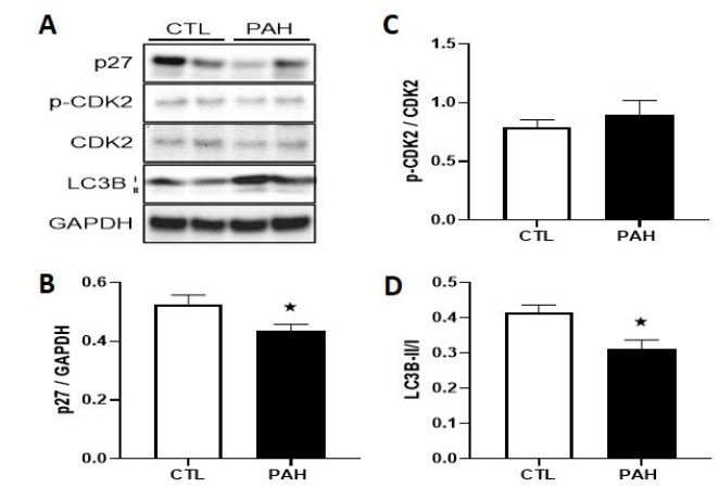 To assess the role of autophagy signaling in the failing right heart, the LC3BII/I ratio was analyzed as a surrogate marker of autophagosome formation. There was a significant decrease in the LC3BII/I ratio in maladapted/failed RV of PAH rats com- pared to CTL rats (P < 0.05; Figure 8A&D). A recent publication identified a p27/CDK2 axis in the regulation of mTOR-depen- dent inhibition of autophagy during heart failure [32]. p27 was significantly decreased in maladapted/failed RV of PAH rats relative to CTL (P < 0.05; Figure 8A&B). However, p-CDK2 was not statistically different (P = 0.22) in PAH rats which likely reflects variances and power influences (Figure 8A&C).