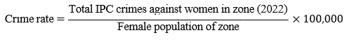 For each geographical zone, the IPC crime rate against women for 2022 was calculated as:
