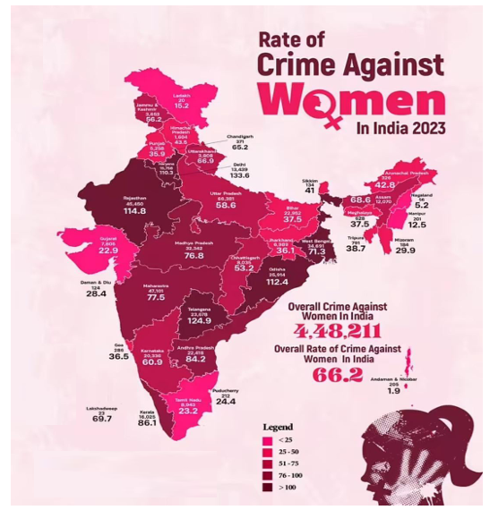 According to the National Crime Records Bureau (NCRB), 4,48,211 cases of crimes against women were registered in India in 2023. This included rape, sexual assault, kidnapping & abduction, trafficking, cruelty by husband or his relatives, dowry-related deaths. In the same year, rape cases were reported approximately every 16–20 minutes in the country and India was ranked 148 out of 170 countries in the Women, Peace and Security Index 2021-22.