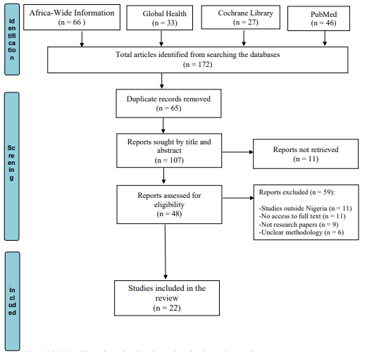 Only peer-reviewed articles on the subject, written in the English language and published between 2019 and 2024, were screened for review. Relevant studies identified in the references of the selected articles, which met the inclusion criteria were also screened. Conversely, articles related to the subject but not carried out in Nigeria, non-peer-reviewed articles, opinion pieces, and articles not providing empirical data or systematic reviews were excluded.