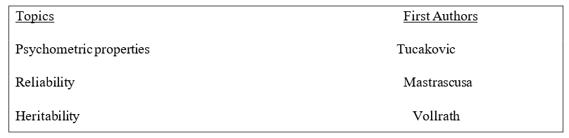 Table 1: Psychometric Properties and Heritability (and First Authors)