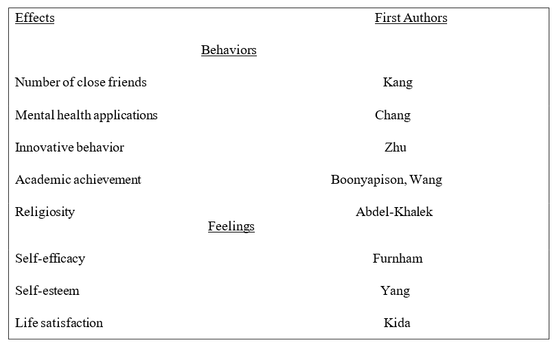 The positive effects of the big five personality types can be categorized as behaviors and feelings (see table 2). The positive behaviors include number of friends, health apps, innovation behavior, academic achievement and religiosity. The positive feelings include self–efficacy, self-esteem, life satisfaction and joy.