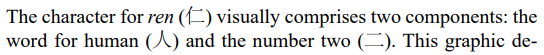 sign inherently conveys its fundamental meaning: the essence of interaction "between two people," signifying human relationships or "co-humanity" within social interaction. This etymological in- sight reinforces the idea that Confucianism is indeed an ethical relationism.