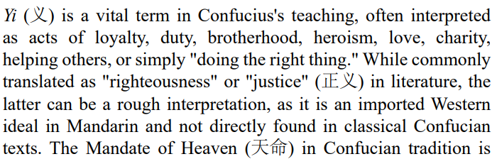 perhaps the closest equivalent to the Western concept of justice, presumably originating from a metaphysical or supernatural realm. Generally, yi can be interpreted as duty and the ethically correct action to take. Consequently, it frequently interchanges with the general sense of ren and other virtues within the tradition.