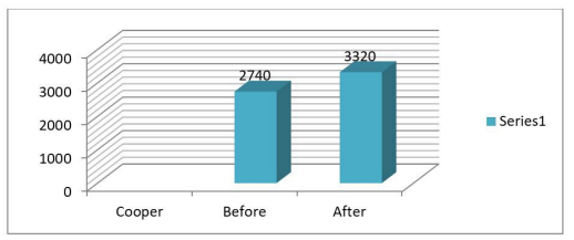 Figure 2 show that sample football players have cooper before supplementations 2,740 meters and after supplementation 3,320 meter. This result show that sample football players have change after supplementing the iron because it enhances hemoglobin to carry out more oxygen this enables to get more energy and in- crease endurances.