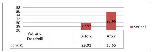 Figure 3 shows that sample football players have Astrand Tread- mill before supplementations 29.93 mls/kg/min and after sup- plementation 35.65 mls/kg/min. This result show that sample football players have change after supplementing the iron be- cause it enhances hemoglobin and players have Vo2 max.