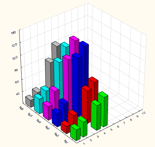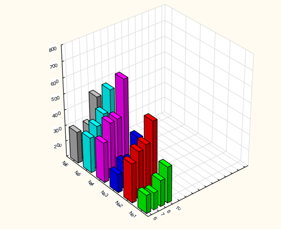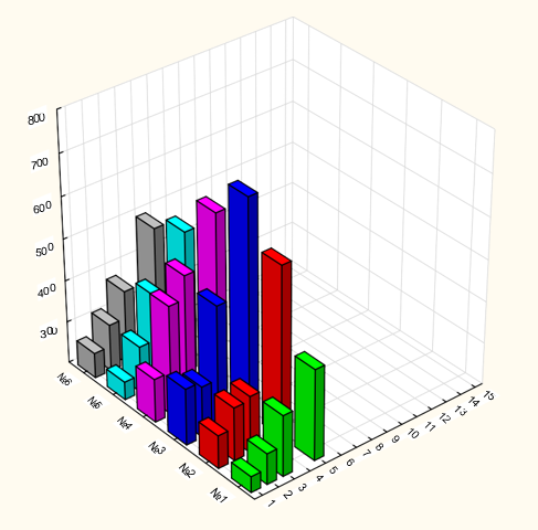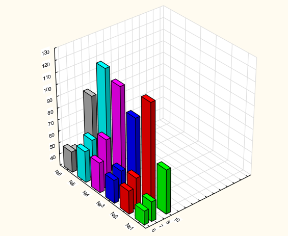 Figure 3: Average leaf area of 6 Crassulae shoots during 10 months after planting. 1, 2, 3 - experimental group - irradiated with a resonator with Pt. 4, 5, 6 - control. Z-axis: mm2, X-axis: month of observation after planting, Y-axis: shoot numbers