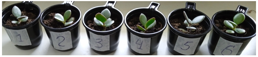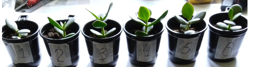 Figure 5: 09.05.2025. A group of Crassula shoots planted on 08.05 (No. 1-No. 2-No. 3 - experimental group, irradiated from a plastic resonator with Al) (No. 4-No. 5-No. 6) - control group