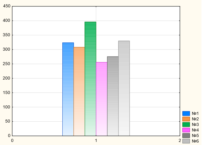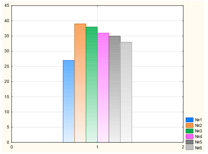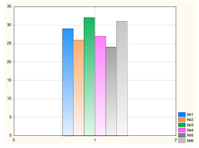 Figure 13: Average area of Crassula leaves 1 month after planting 6 shoots, 1, 2, 3 - irradiated with a W emitter. Along the ordinate axis:mm2. Along the abscissa axis: shoot numbers (left to right)